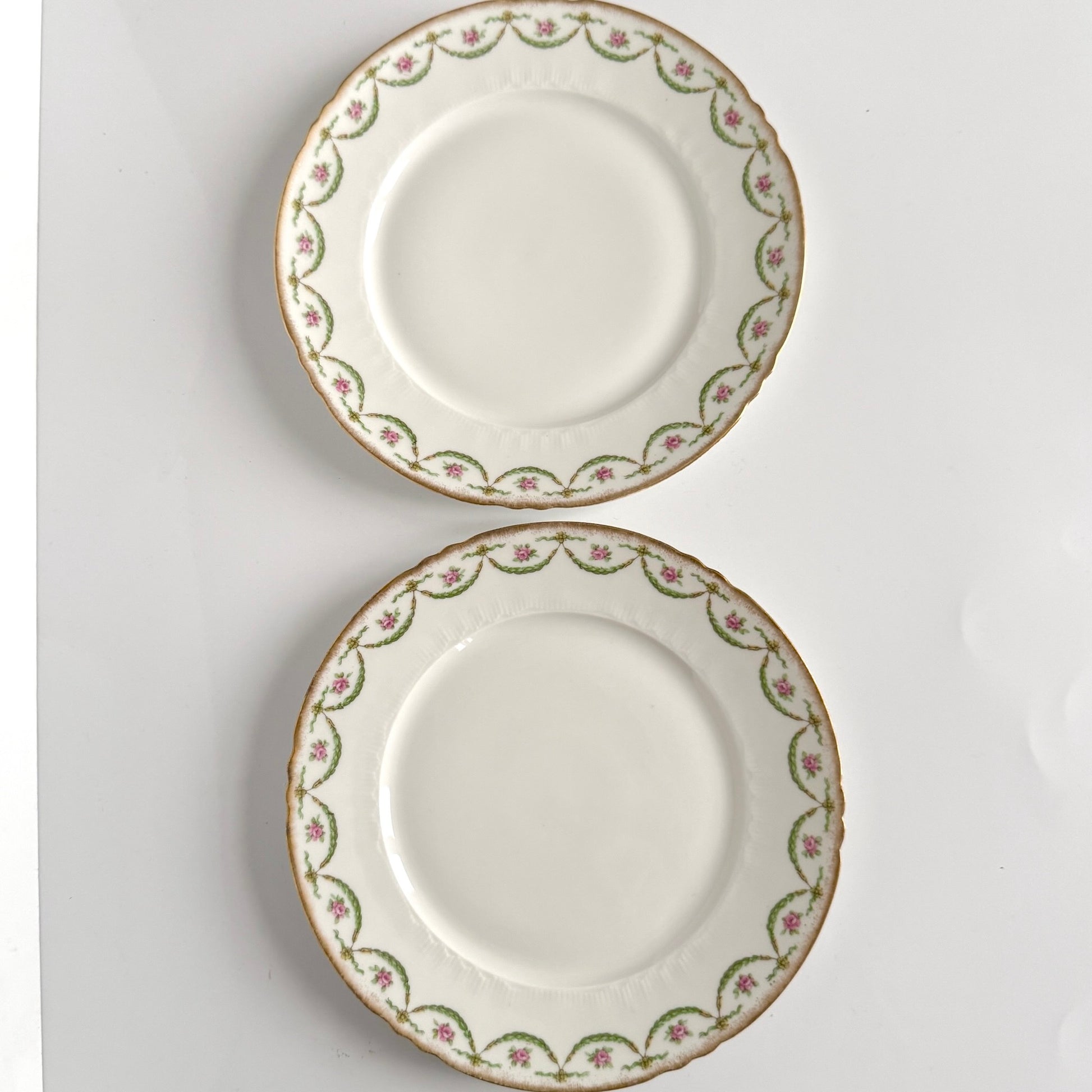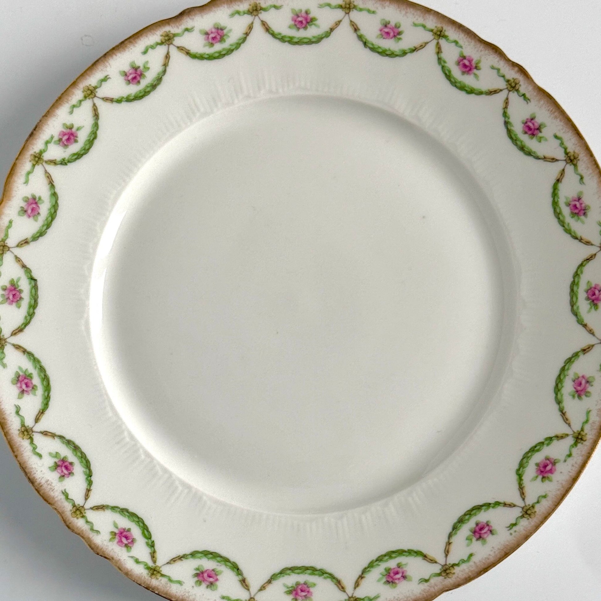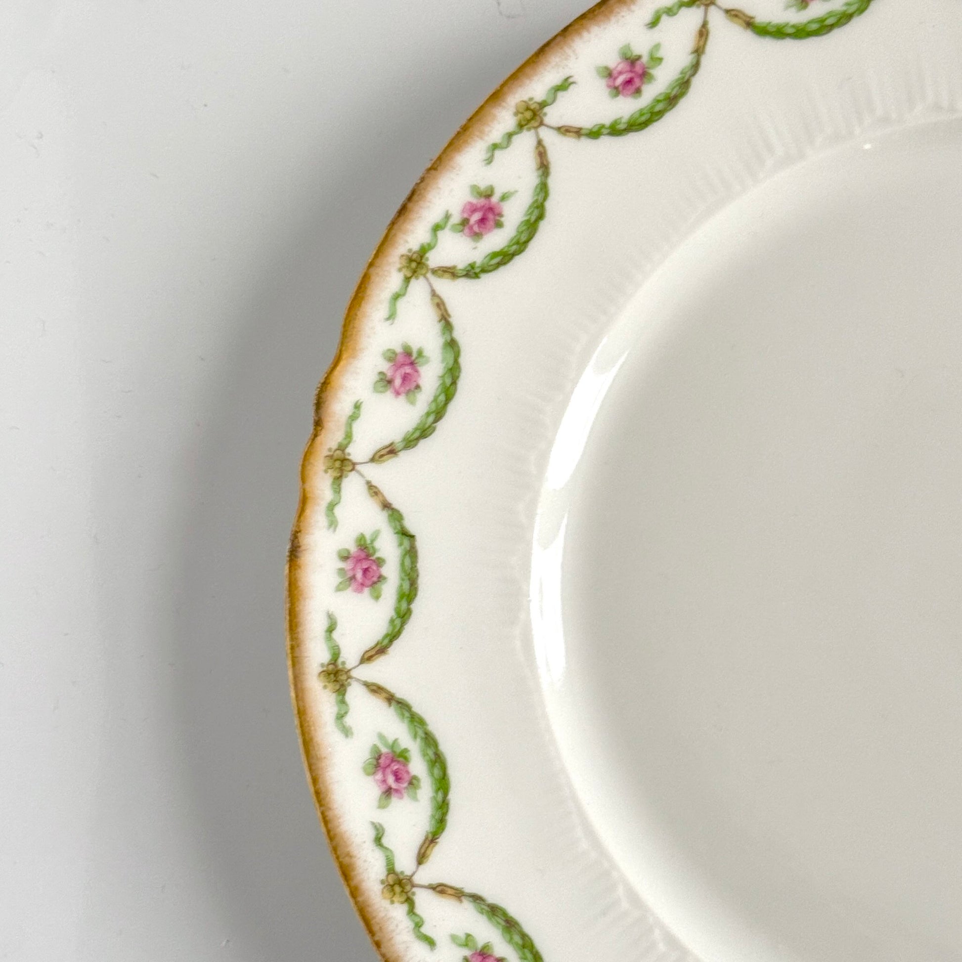 Charmantes assiettes à dessert fabriquées à Limoges entre les années 1890 et 1920, délicat décor de semis de roses et de guirlandes rehaussé d’une jolie dorure sur le bord.