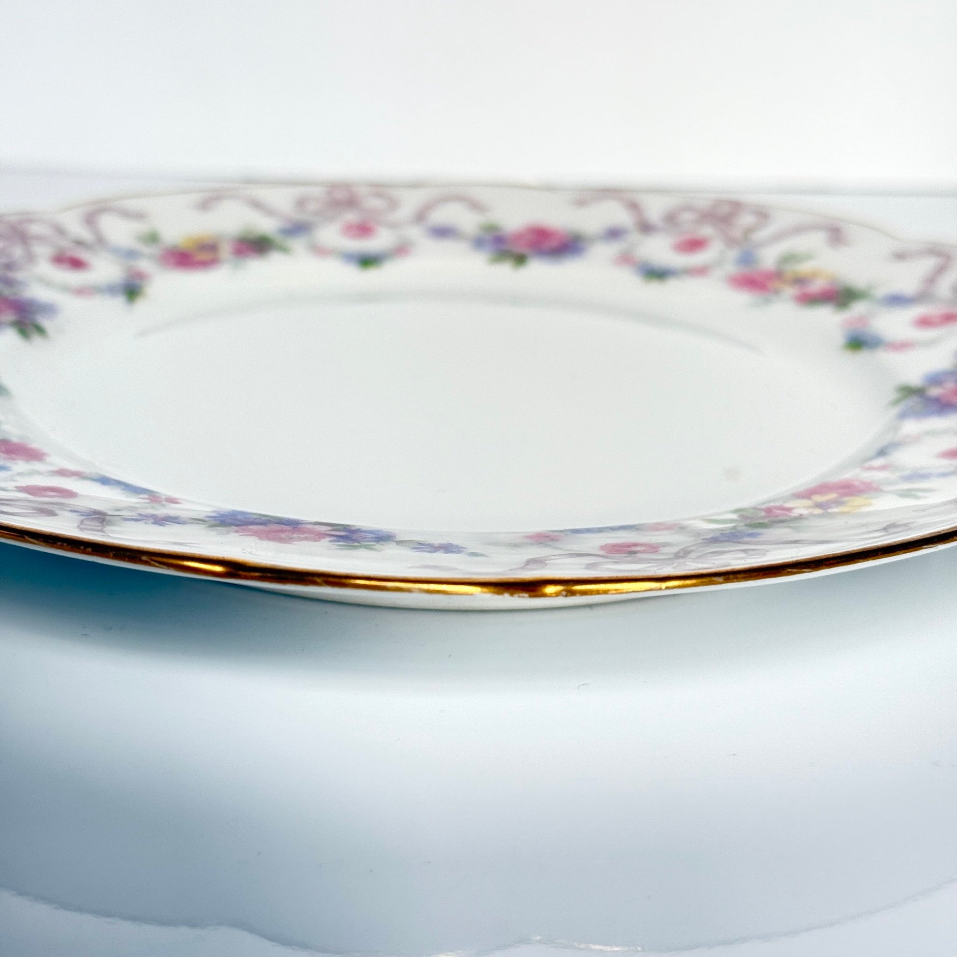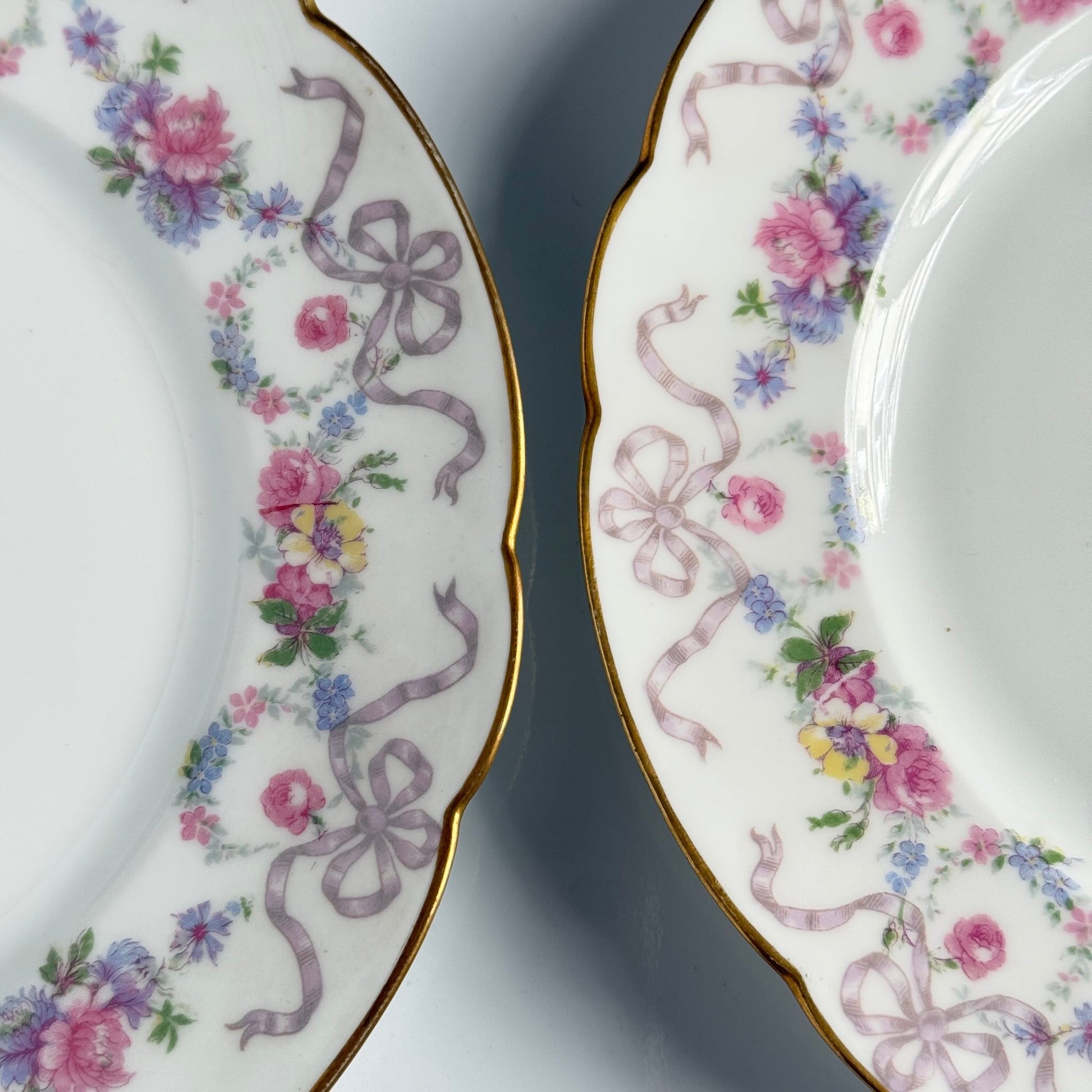 フランス・リモージュ製磁器のデザートプレート。やわらかなスカラップ(波型)リムに、ガーランドとリボンのモチーフが繊細なパステルカラーで施され、縁には上品な金彩が添えられています。